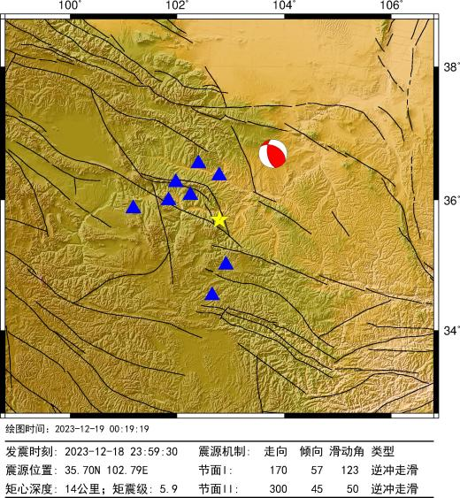 针对国内M≥4.0,国外M≥7.0的地震,震后15分钟左右产出地震震源机制解和震区周边历史地震震源机制解。震源机制解通过给出走向、倾向和滑动角来描述地震发生时断层滑动的方式和方向。通过本次地震和邻近区域历史地震震源机制解,可以了解地震的物理过程,包括断层的类型、滑动方向、应力状态等,以及构造带的应力分布状况。为了更为直观,通常用使用彩色的震源球来展示震源机制(图5)。震源机制解是地震烈度、震源破裂过程和地震预测预报等工作的必须基础数据支撑。