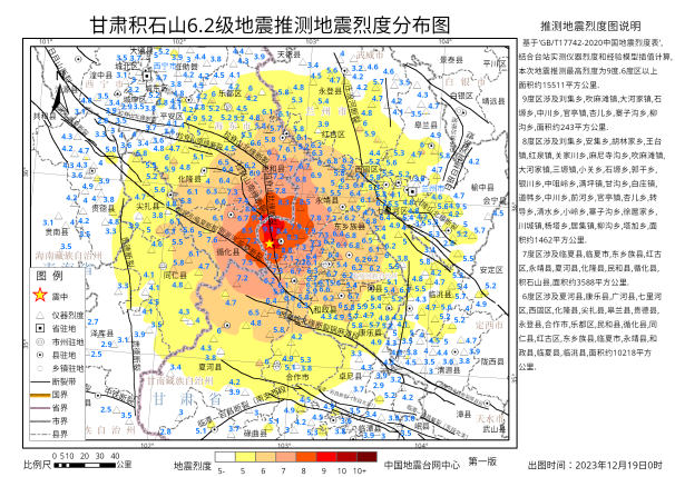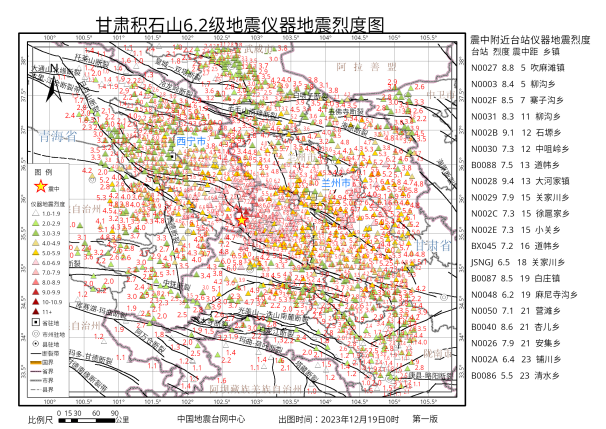 收到正式速报参数后 5分钟左右自动产出震中周边台站仪器地震烈度和震区范围推测地震烈度分布,震后30分钟至2小时人工复核更新。仪器地震烈度分布是利用台站观测地震动记录快速计算各观测点的地震烈度、峰值地动速度(PGV)和峰值地动加速度(PGA),再利用插值算法给出震区周边一定范围内地震烈度强弱空间分布(纪推测地震烈度分布图),结合GIS技术在背景地图上快速发布。地震烈度分布图可帮助指挥人员迅速判断受灾区域和受灾程度,从而制定科学合理的救援方案,同时可为灾后恢复生产和重建工作提供有力支持。