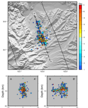 震后数小时至数天持续更新余震精定位结果。余震精定位结果是指对主震的余震序列重新精确定位(图12)。由于地震发生过程很快,且余震数量较多,难以做到实时准确分析。通过对大量的余震进行监测和研究,可以更准确地了解地震的破裂模式、断层几何形状以及地壳内部的应力状态,加深对地震发生机制的理解。此外,余震可能引发新的破坏或加剧现有损害,通过精确定位,救援人员可以更有效地评估受灾区域的安全状况。