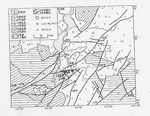 图1 龙南5.0级地震区地质构造及地震震中分布图[3]