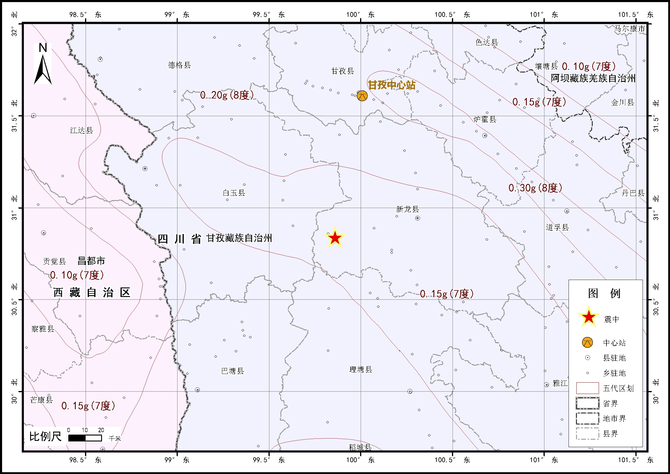 根据第四代区划图(2001.8—2016.5)和第五代区划图(2016.6—),震中均位于Ⅶ度(7度)设防区。