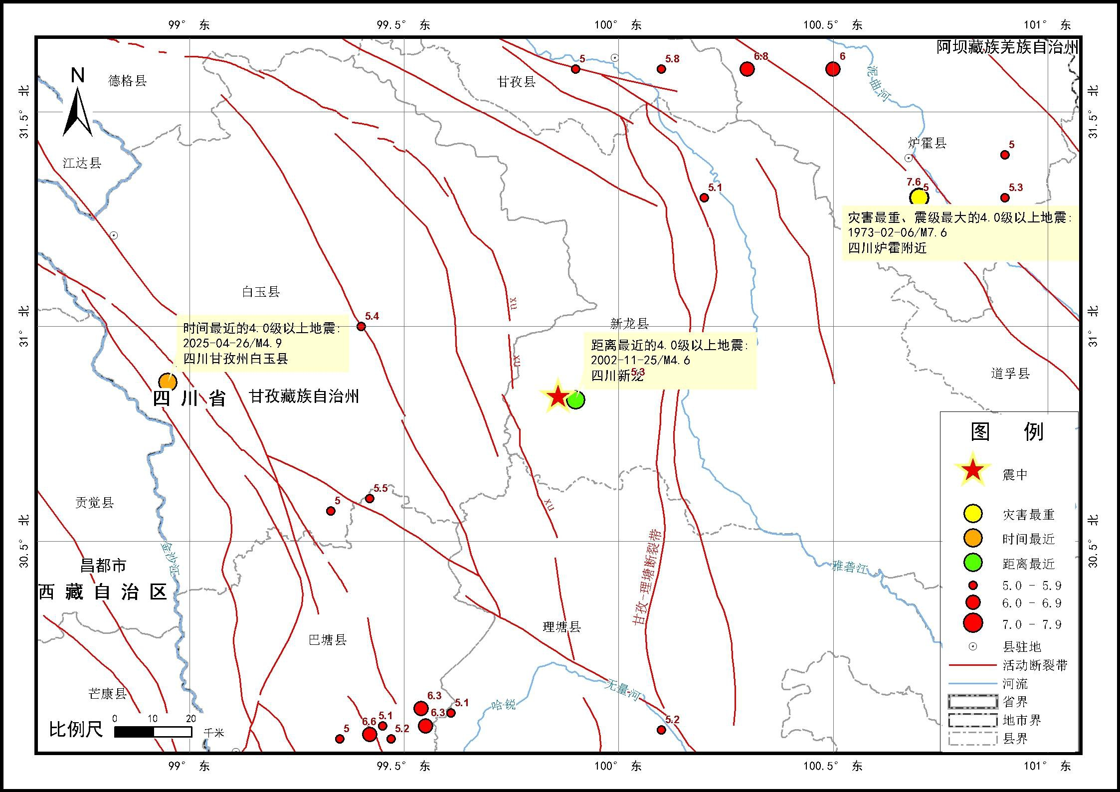 距离最近的4.0级以上地震是2002年11月25日的四川新龙4.6级地震,距震中4公里,未造成人员伤亡。
