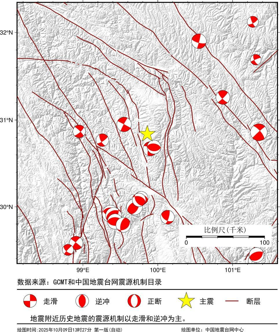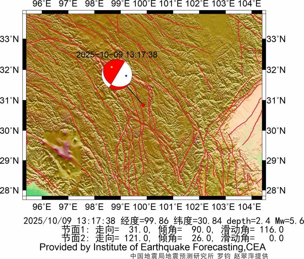 据中国地震局地震预测研究所产出,2025年10月09日13时17分四川甘孜州新龙县M5.4级地震震源机解结果为:矩震级Mw约5.6。断层节面1走向=31.0 倾角=90.0 滑动角116.0;节面2走向=121.0 倾角=26.0 滑动角=0.0。波形拟合的质心深度为2.4千米。