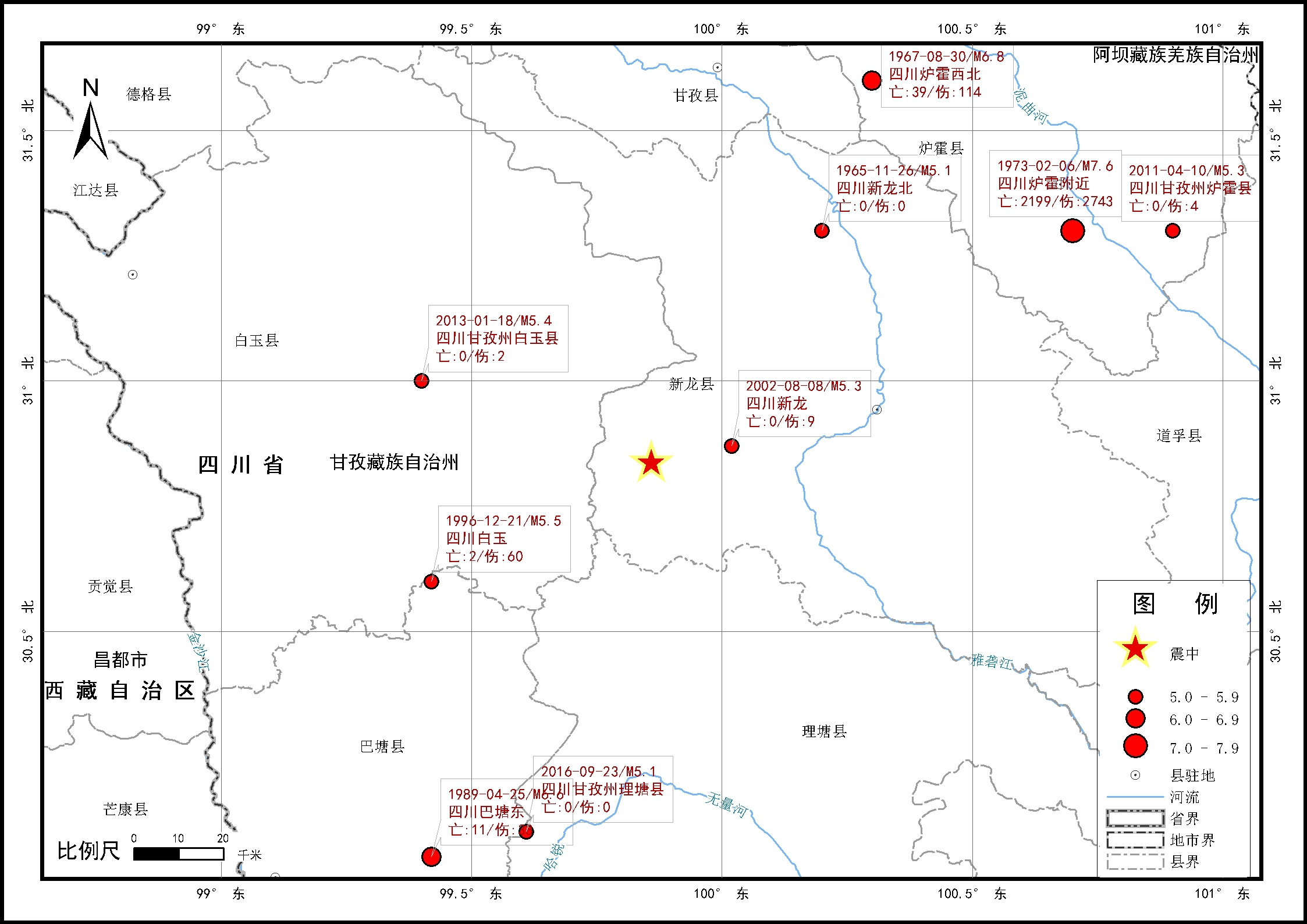 灾害最重、震级最大的4.0级以上地震是1973年2月6日的四川炉霍附近7.6 级地震,距震中95公里,死亡2199人,受伤2743人,经济损失20.00 亿元。
