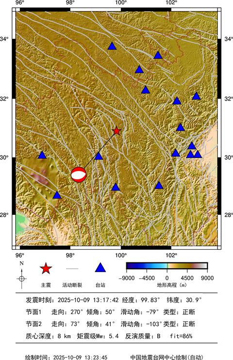 据中国地震台网中心产出,2025年10月09日13时17分四川甘孜州新龙县M5.4级地震震源机解结果为:矩震级Mw约5.4。断层节面1走向=270 倾角=50 滑动角=-79;节面2走向=73 倾角=41 滑动角=-103。波形拟合的质心深度为8千米。滑动类型以正断型为主。