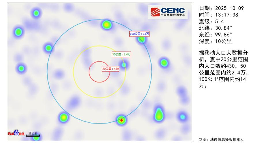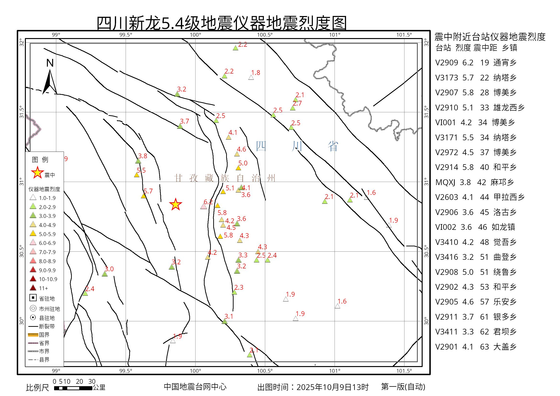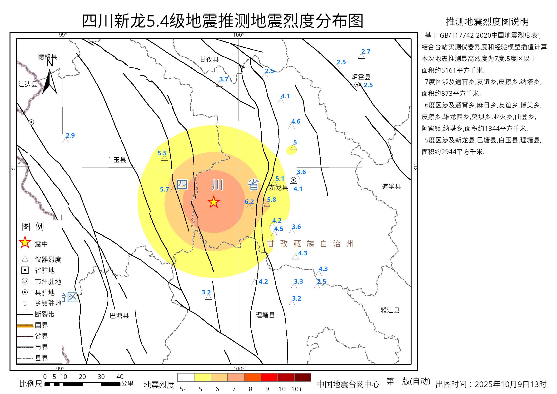 据中国地震台网测定,北京时间2025年10月9日13时17分,在四川甘孜州新龙县(北纬30.84度,东经99.86度)发生5.4级地震,震源深度10公里。震中10公里范围内平均海拔约4406米。