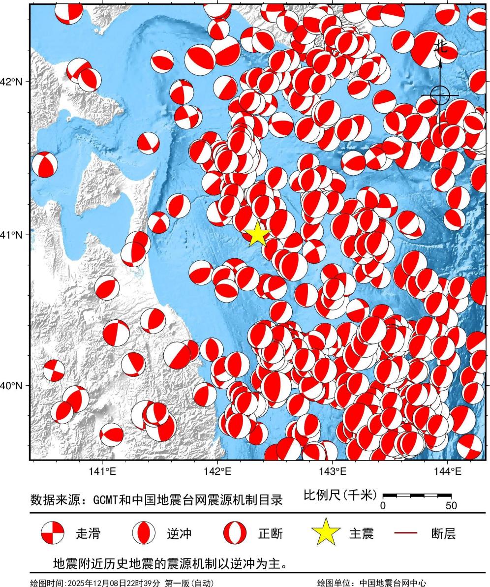 据中国地震台网测定,北京时间2025年12月08日22时15分,在日本本州东部附近海域(北纬41.00度,东经142.35度)发生7.5级地震,震源深度约为50公里。地震发生在海域,震中5公里范围内平均海拔约-1332米,距离最近的海岸线或海岛约84公里。