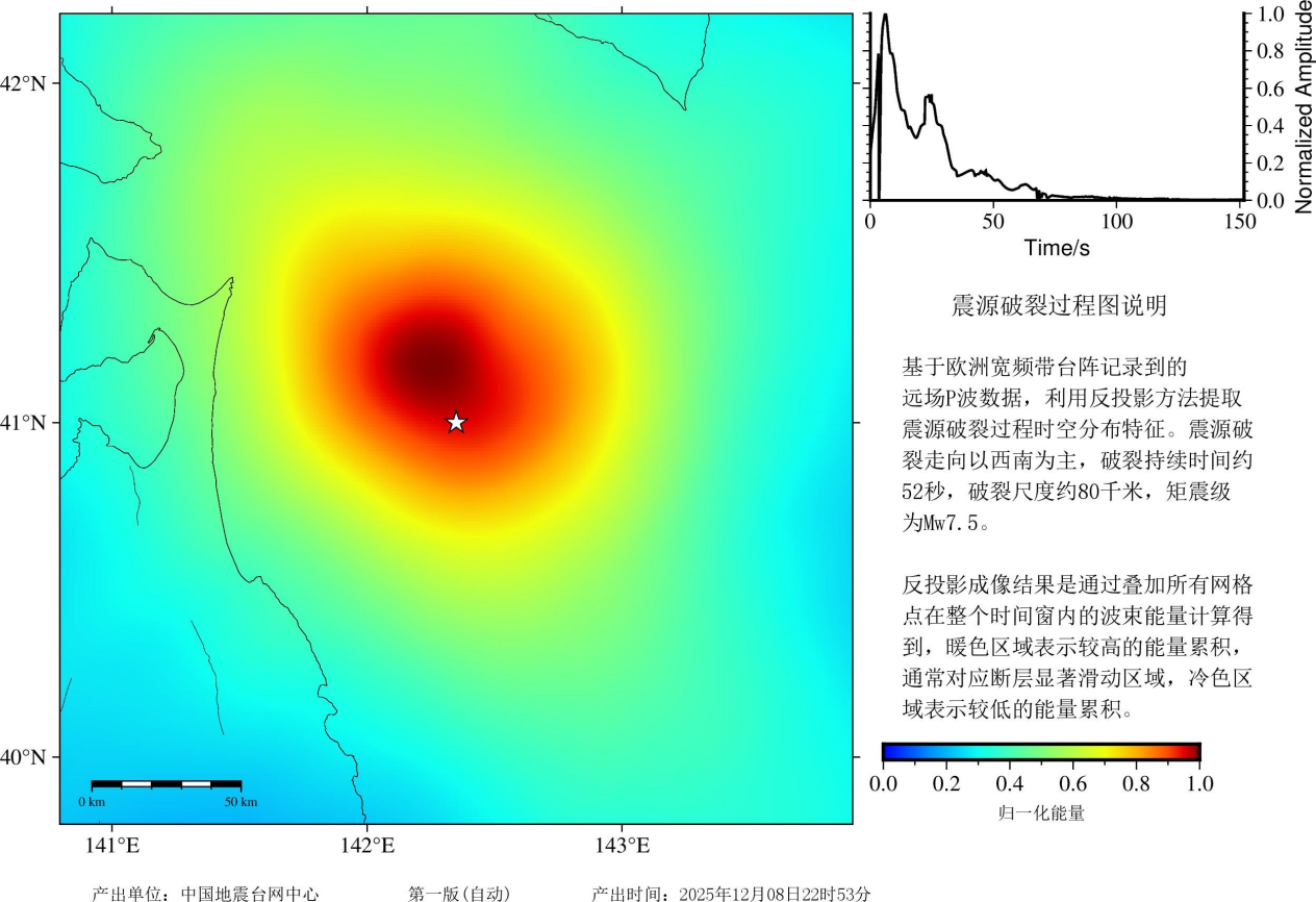 据中国地震台网中心产出,2025年12月08日22时15分日本本州东部附近海域M7.5级地震震源机解结果为:矩震级Mw约7.5。断层节面1走向=28 倾角=66 滑动角=106;节面2走向=173 倾角=29 滑动角=58。波形拟合的质心深度为60千米。初步推断此地震为一次逆断型为主事件。