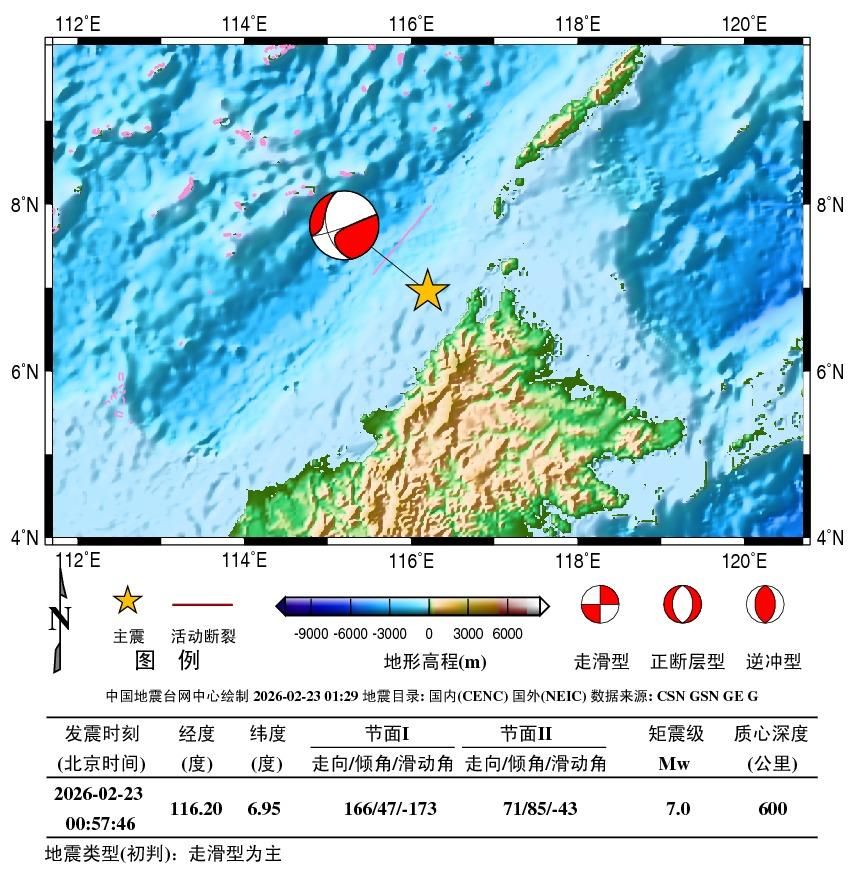 据中国地震台网正式测定:北京时间2026年02月23日0时57分(当地时间),在加里曼丹岛附近海域(北纬6.95度,东经116.20度)发生7.0级地震,震源深度620公里。地震发生在海域,震中5公里范围内平均海拔约-46米,距离最近的海岸线或海岛约29公里。