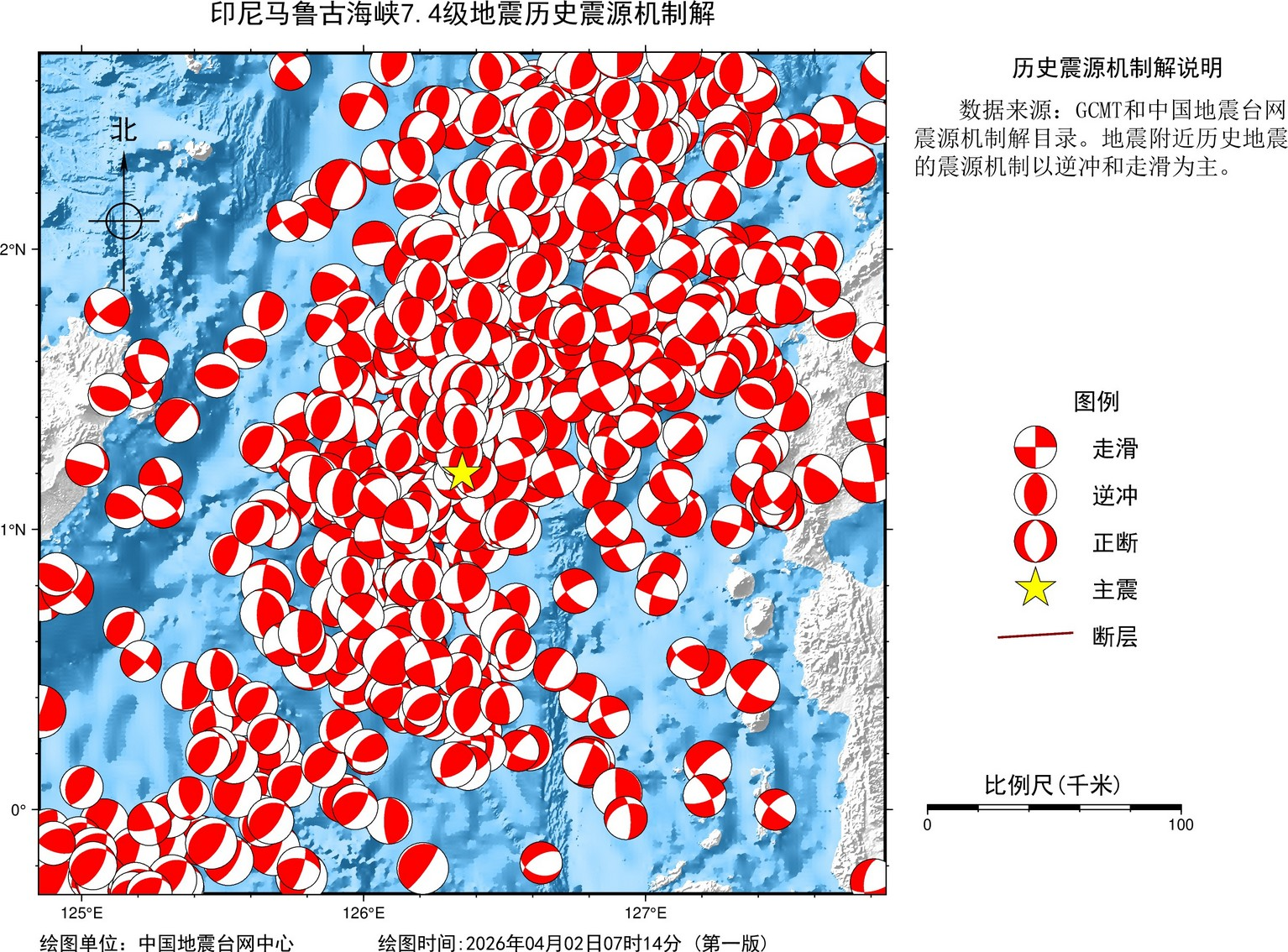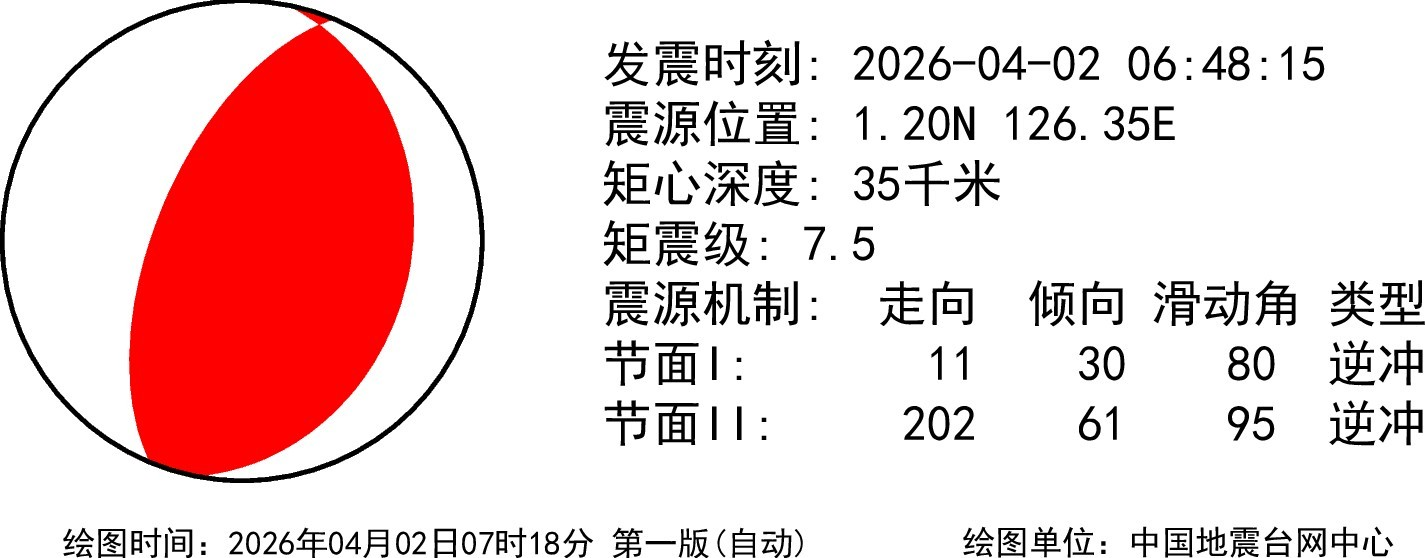 据中国地震台网正式测定:北京时间2026年04月02日06时48分(当地时间04月02日07时48分),在印尼马鲁古海峡(北纬1.20度,东经126.35度)发生7.4级地震,震源深度30千米。